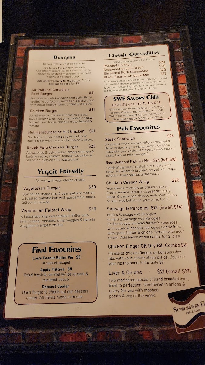 Finish off your meal with Lou's Peanut Butter Pie, a secret recipe dessert that is sure to satisfy your sweet tooth. With its welcoming atmosphere and delicious dishes, Somewhere Else Pub & Grill is a great choice for a casual dining experience.